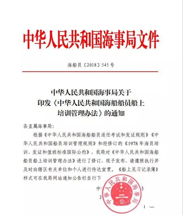 各直屬海事局: 根據(jù)《中華人民共和國(guó)海船船員適任考試和發(fā)證規(guī)則》《中華人民共和國(guó)船員培訓(xùn)管理規(guī)則》和經(jīng)修訂的《1978 年海員培訓(xùn)、發(fā)證和值班標(biāo)準(zhǔn)國(guó)際公約》,我局對(duì)《中華人民共和國(guó)海船船員船上培訓(xùn)管理辦法》進(jìn)行了修訂,現(xiàn)予發(fā)布,請(qǐng)遵照?qǐng)?zhí)行并及時(shí)向轄區(qū)有關(guān)單位和個(gè)人進(jìn)行傳達(dá)宣貫?!洞弦?jiàn)習(xí)記錄簿》樣式可在我局網(wǎng)站通知公告欄自行下載。